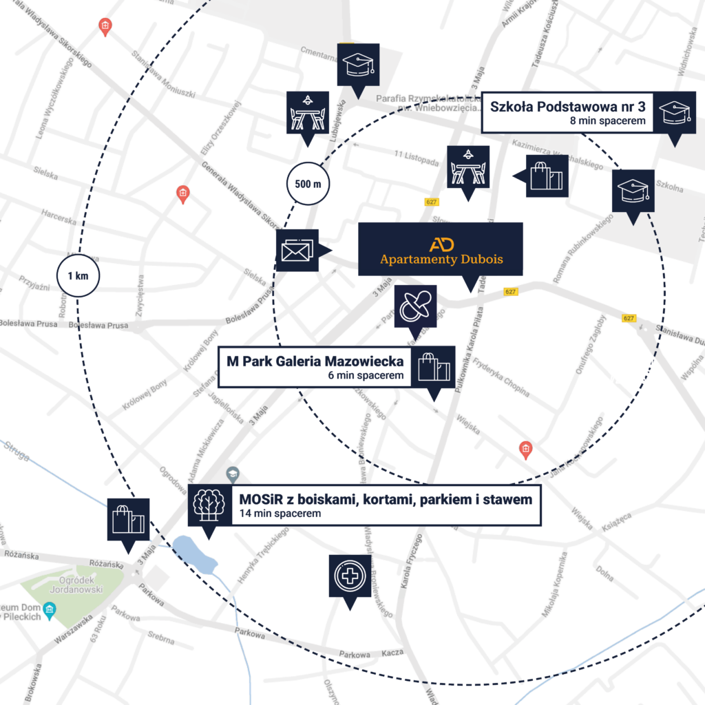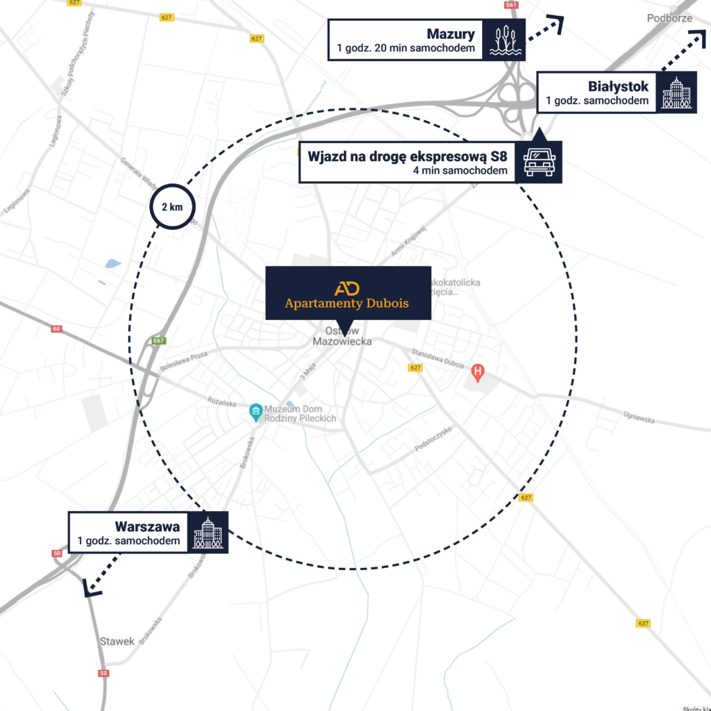 Apartamenty Dubois znajdują się u zbiegu ulic Dubois i Tadeusza Kościuszki w Ostrowi Mazowieckiej. Mieszkając w tej lokalizacji, na co dzień docenisz nie tylko wygodny dostęp do pełnej infrastruktury miasta, ale także świetne skomunikowanie okolicy z całym regionem. Ostrów łączy trasę S8 i Via Baltica, umożliwiając szybki dojazd do wielu atrakcyjnych destynacji, takich jak malownicze Mazury czy urokliwe wybrzeże Morza Bałtyckiego. Dodatkowo, doskonale rozwinięta infrastruktura komunikacyjna zapewnia komfortowe podróżowanie pomiędzy Warszawą, a stolicą Podlasia – Białymstokiem.
